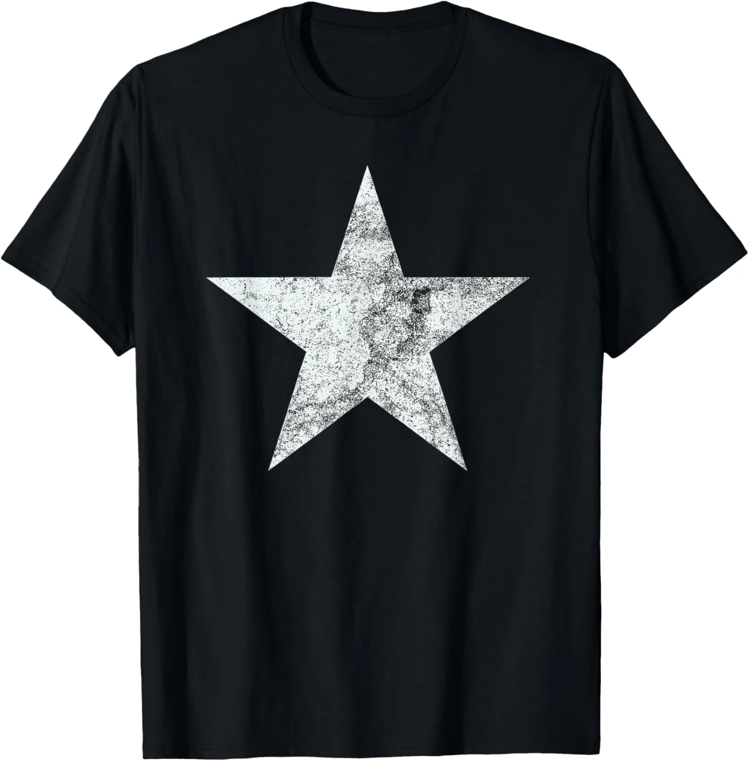 The standout feature is the distressed effect—the star’s surface is intentionally uneven, with worn patches, scratches, and fine grain textures to create a vintage or grunge appearance. This effect enhances the shirt’s classic, rugged, and stylish character.