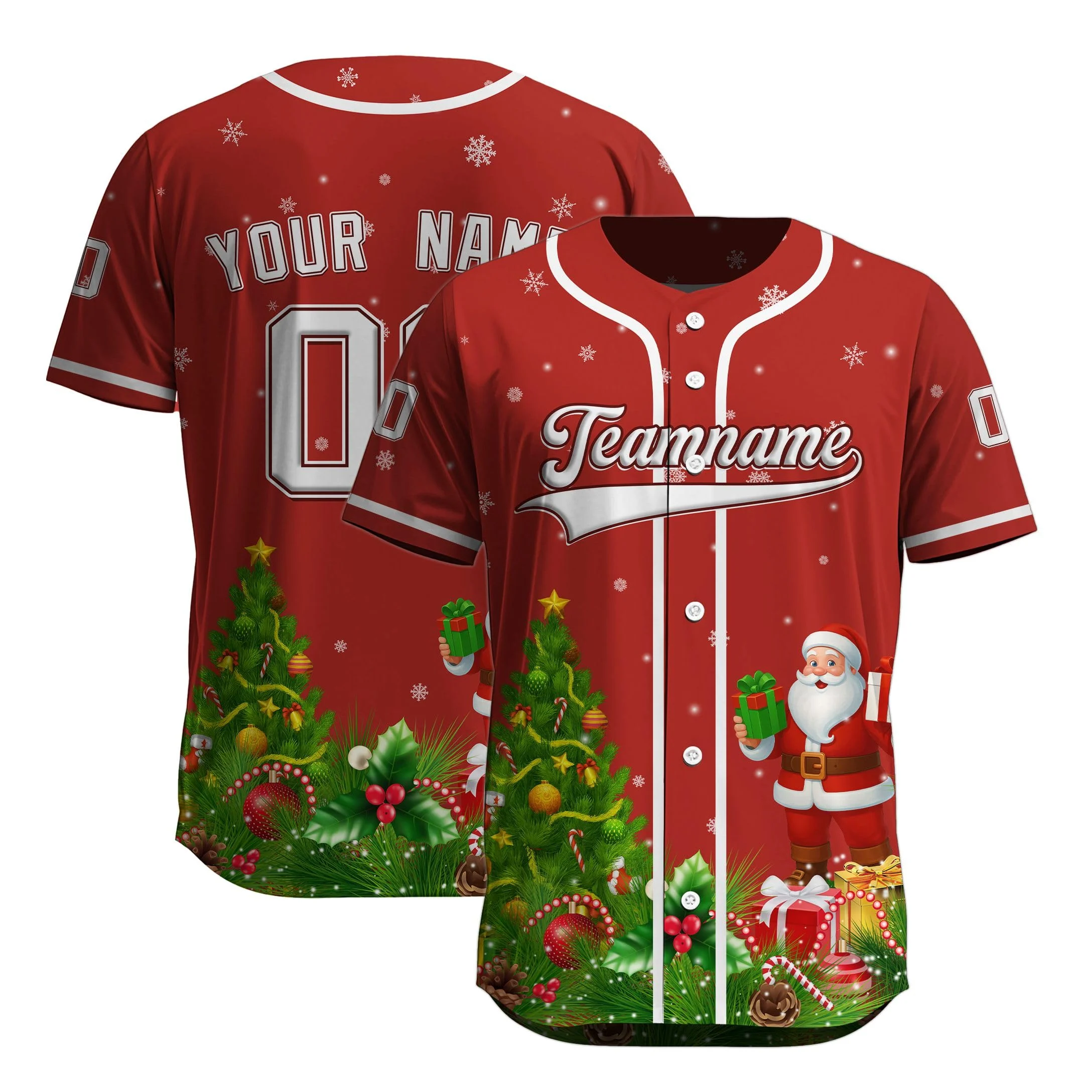 Santa Claus: A cheerful Santa Claus appears on the front of the jersey, complete with his signature red suit and white beard, holding a stack of beautifully wrapped gifts.