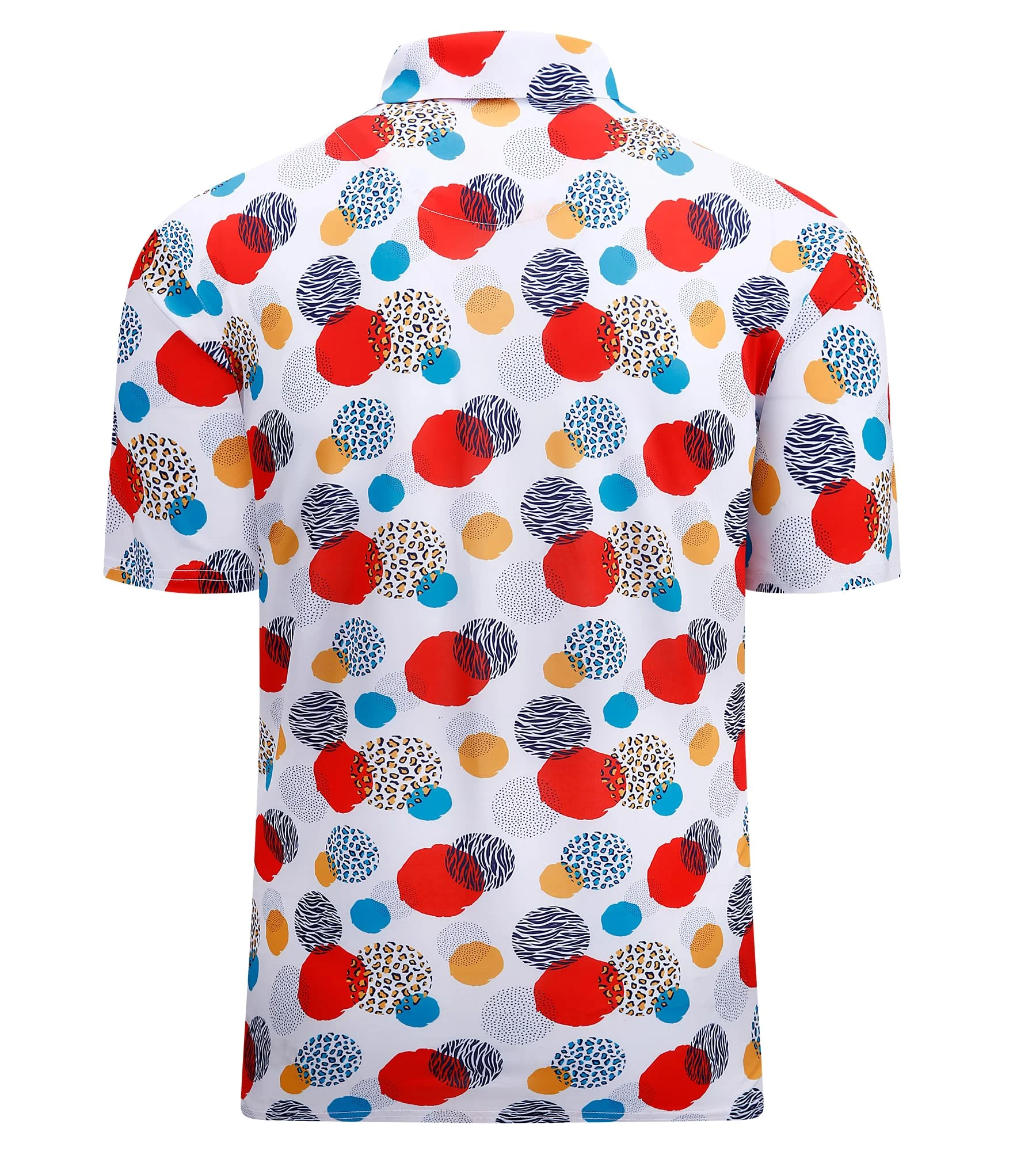 The shirt features a vibrant all-over abstract polka dot/multi-colored pop-art pattern on a white fabric base. The circular dots vary in size and style: