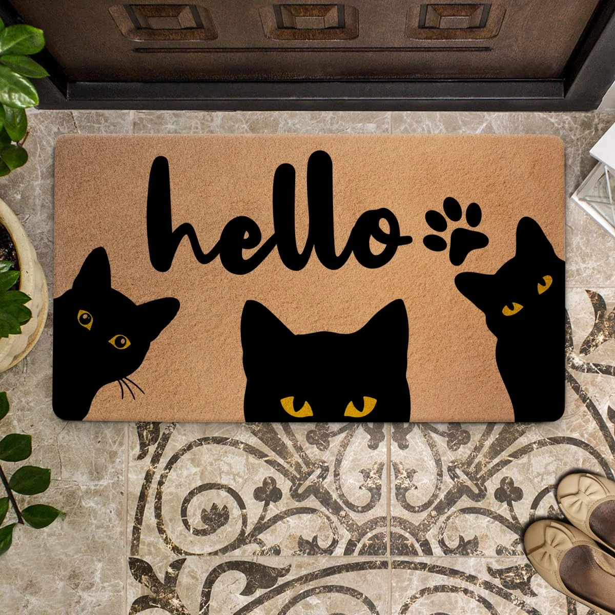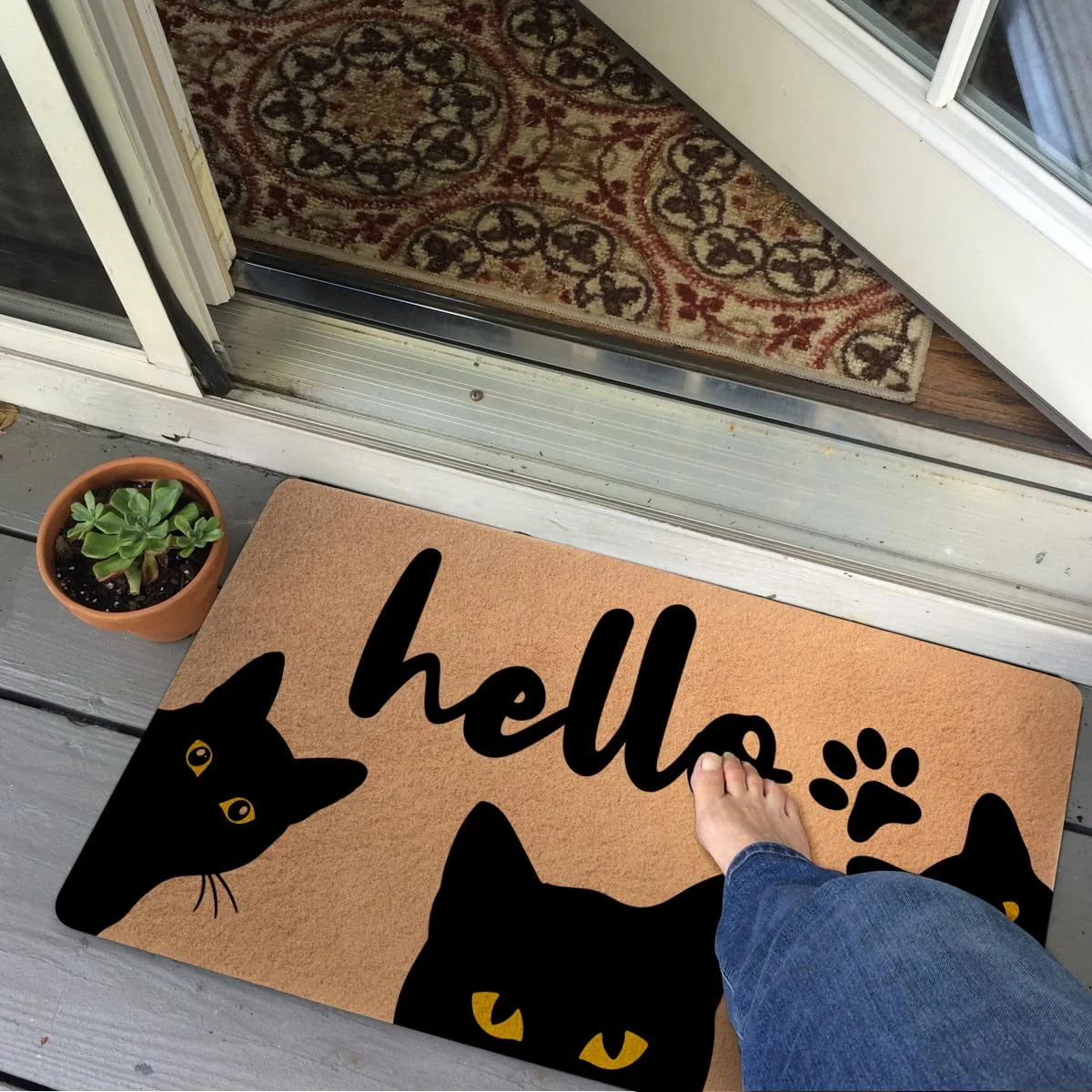Playful Black Cat Design: This durable doormat features three adorable black cats and the word “hello” with a paw print, creating a unique and whimsical style. The engraved patterns on the surface ensure the design remains clear even with regular use.